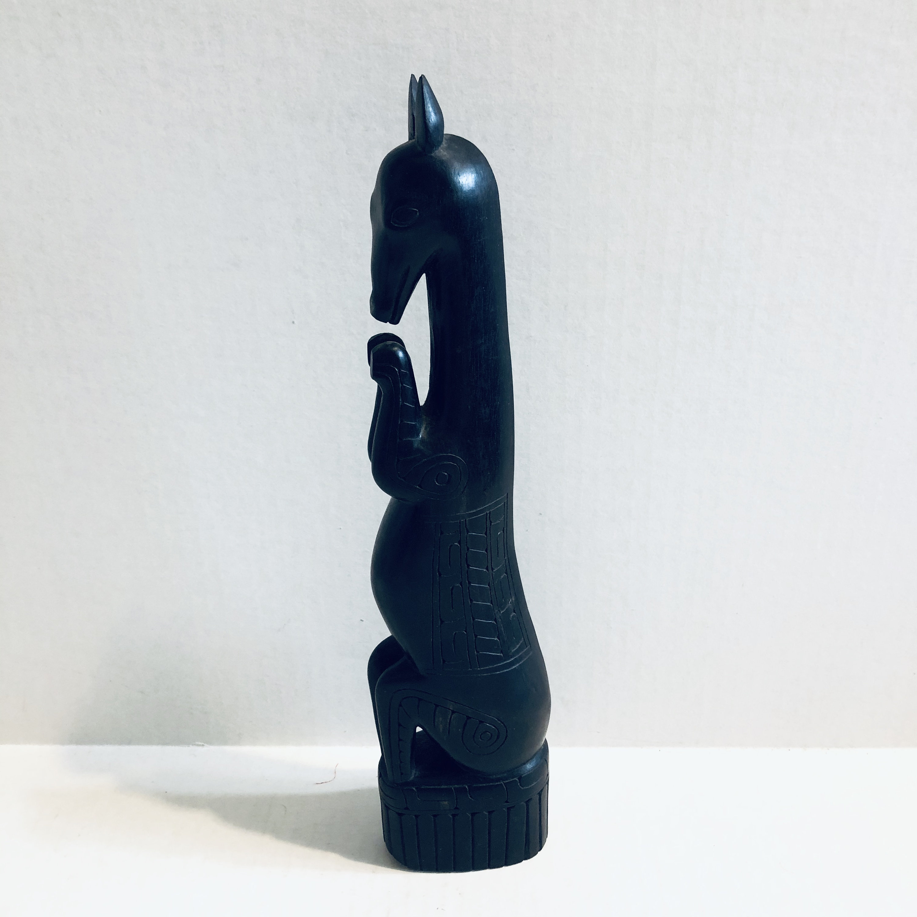 This seated African Black Horse appears to be a replica of statues placed on the shrine of Shango from the Yoruba empire in West Africa. In the Yoruba religion, Shango was an Orisha, or spirit sent by Olodumare who brought guidance to creatures and humanity. Shango was the god of thunder, justice, virility and fire.