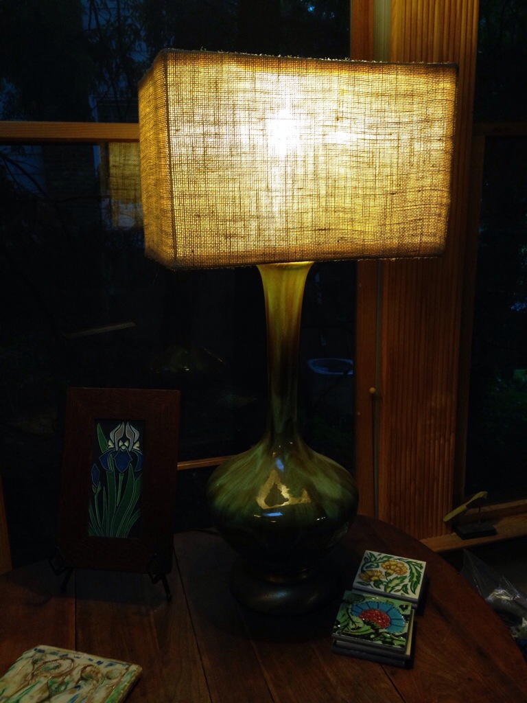 This is an awesome Danish Modern lamp. It’s got a beautiful glaze. There is a chip on the rim up towards the top by the shade that can be repaired. I’m currently asking $75 for this cool piece of vintage decor.
