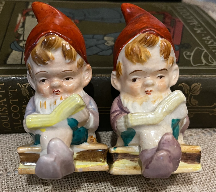 Here we have ceramic figurines of gnomes. They are designed as salt and pepper shakers, gained significant popularity in the mid-20th century as decorative and functional kitchen items. These often featured whimsical characters like gnomes, animals, or popular cartoon figures, appealing to a wide audience. Many were produced in Japan during this era, known for its mass production of affordable and charming collectibles.