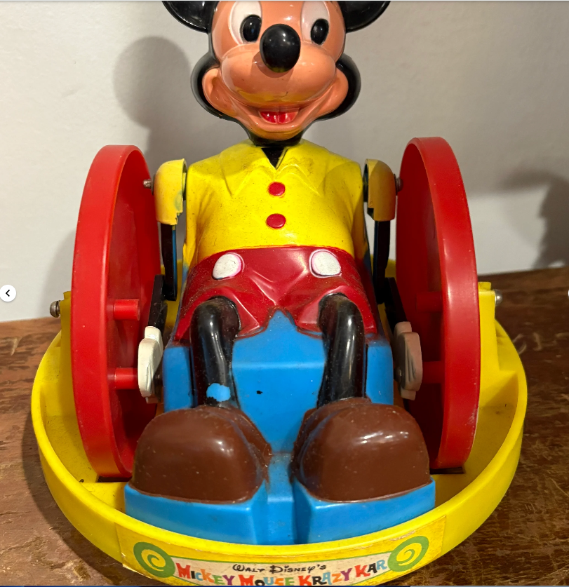 The Mickey Mouse Krazy Kar toy is a colorful, somewhat psychedelic design featuring Mickey Mouse in a seat with two large pinwheels attached to his arms. Underneath, a battery-operated motor causes Mickey to spin in various directions.
