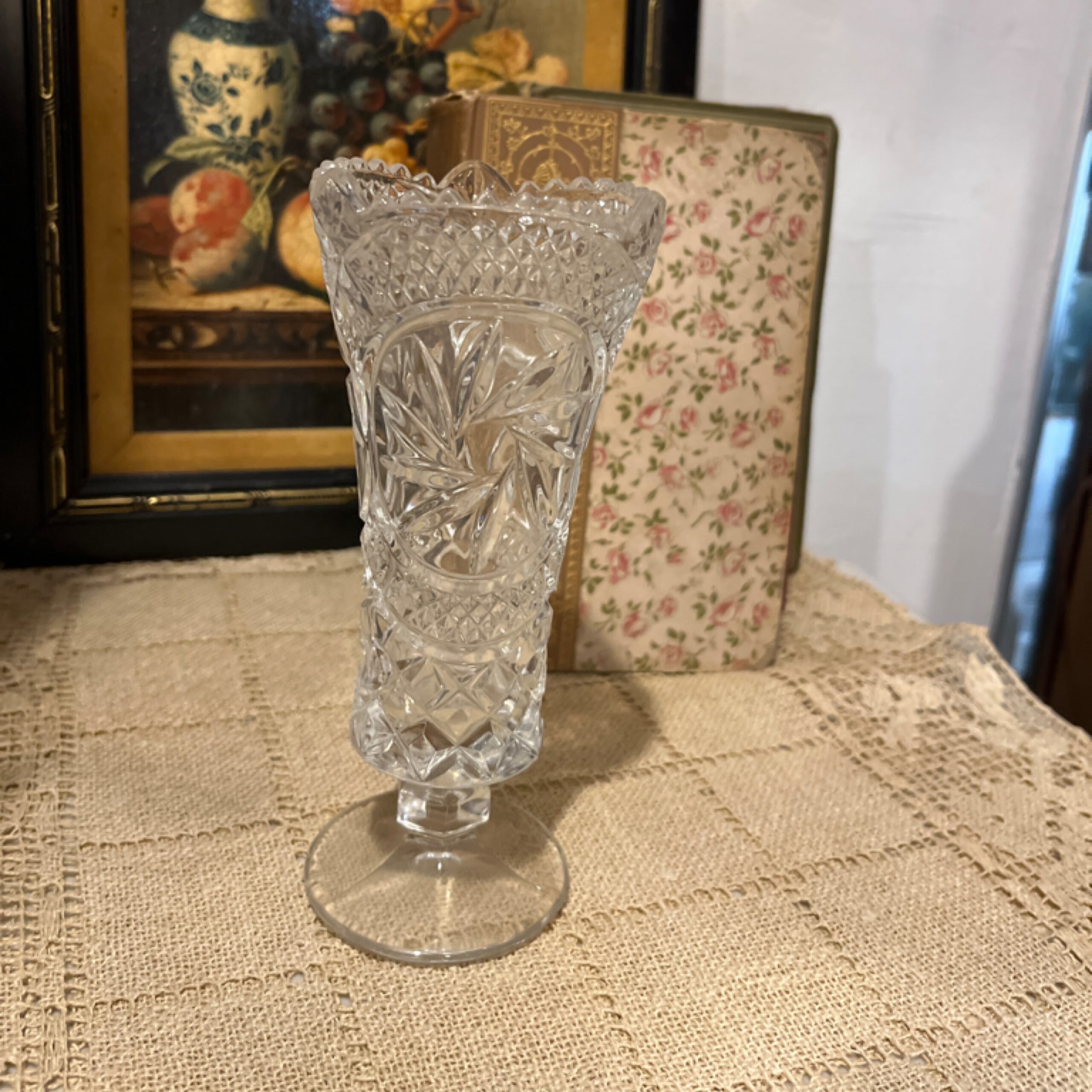 This particular vase showcases classic cut glass designs, such as pinwheels and diamond motifs, which were popular in the mid-century period. Such decorative items were commonly used in homes to display flowers or as standalone decorative pieces, reflecting a taste for elegant and functional home decor. The use of 24% lead crystal indicates a premium quality, sought after by collectors for its aesthetic appeal and the satisfying weight and resonance it provides. 941