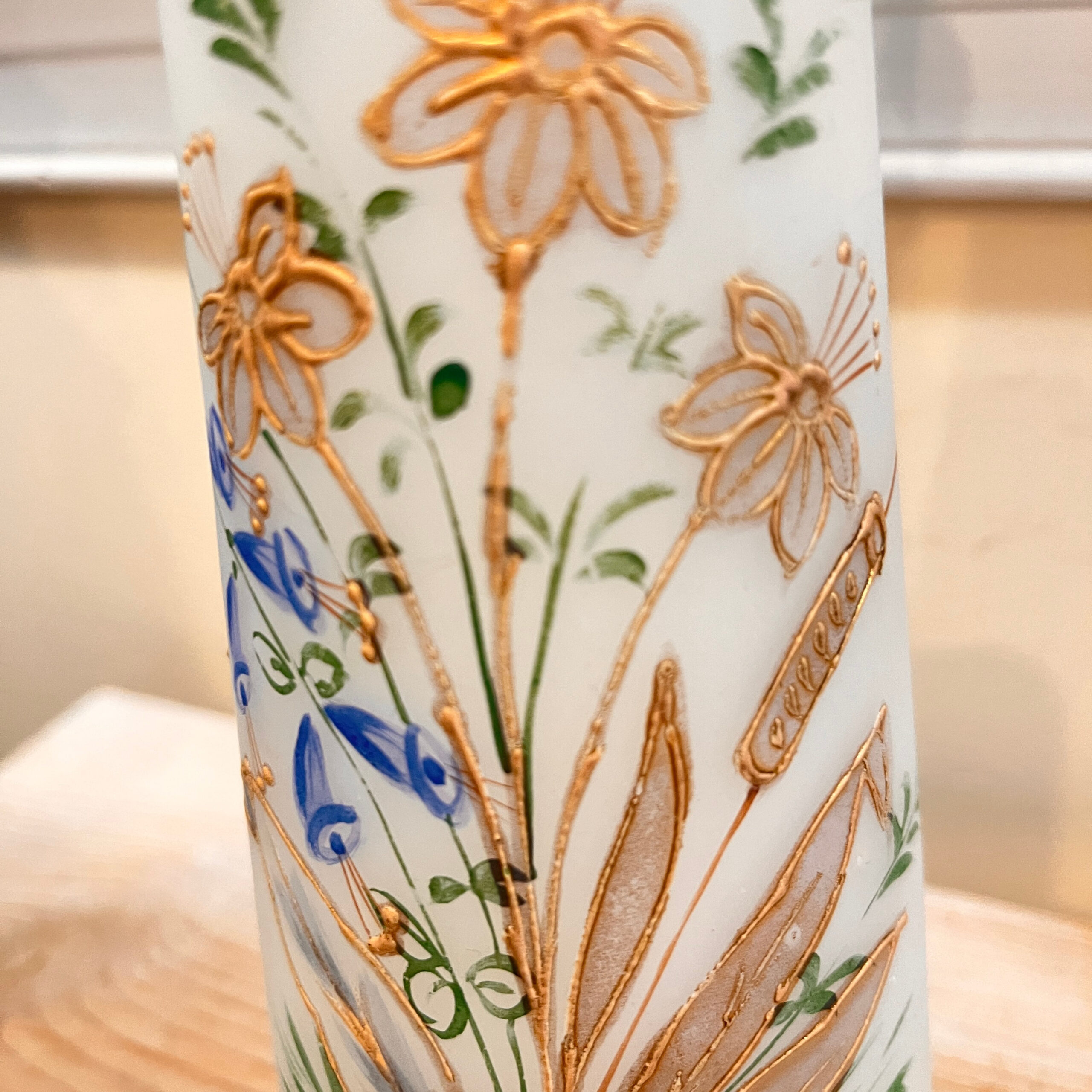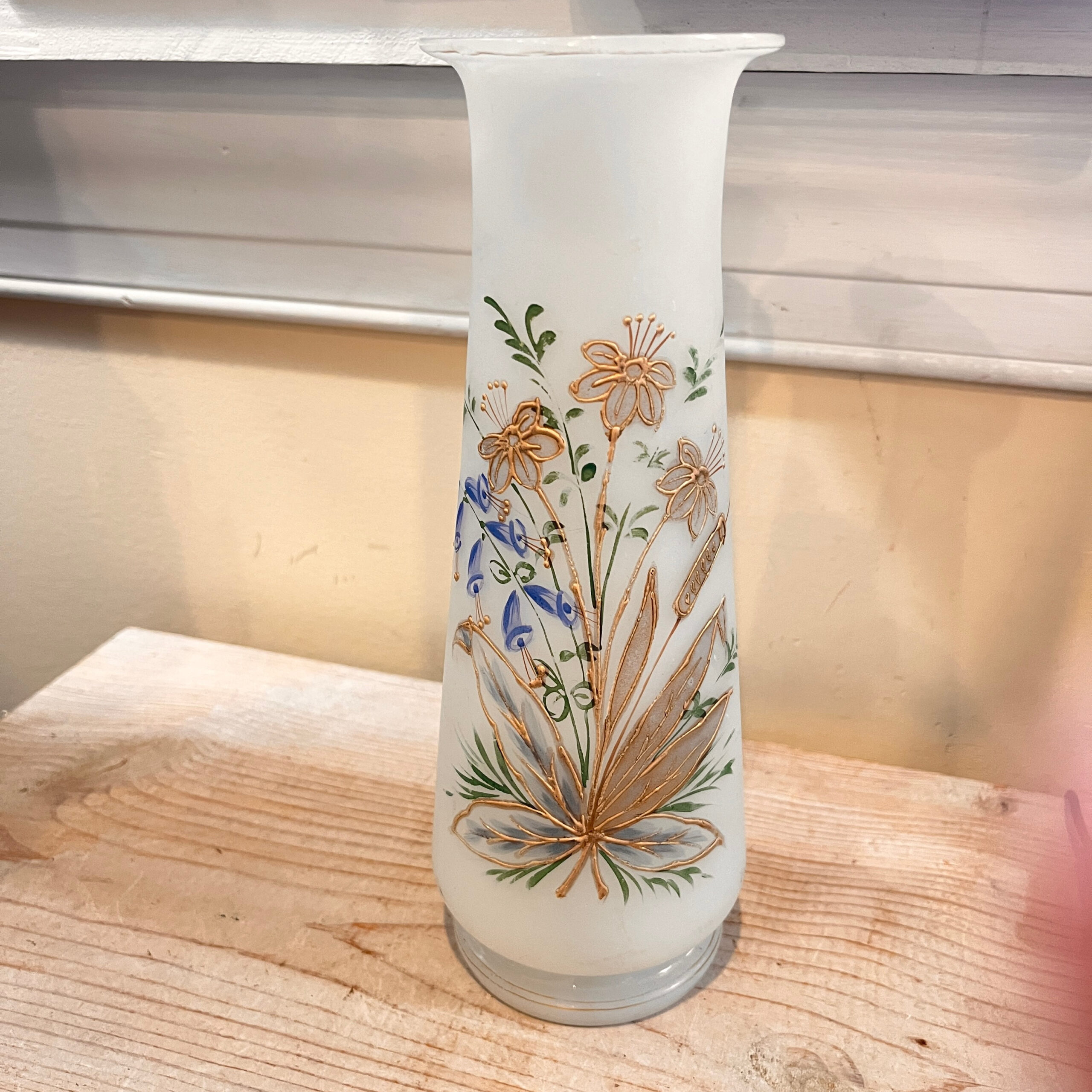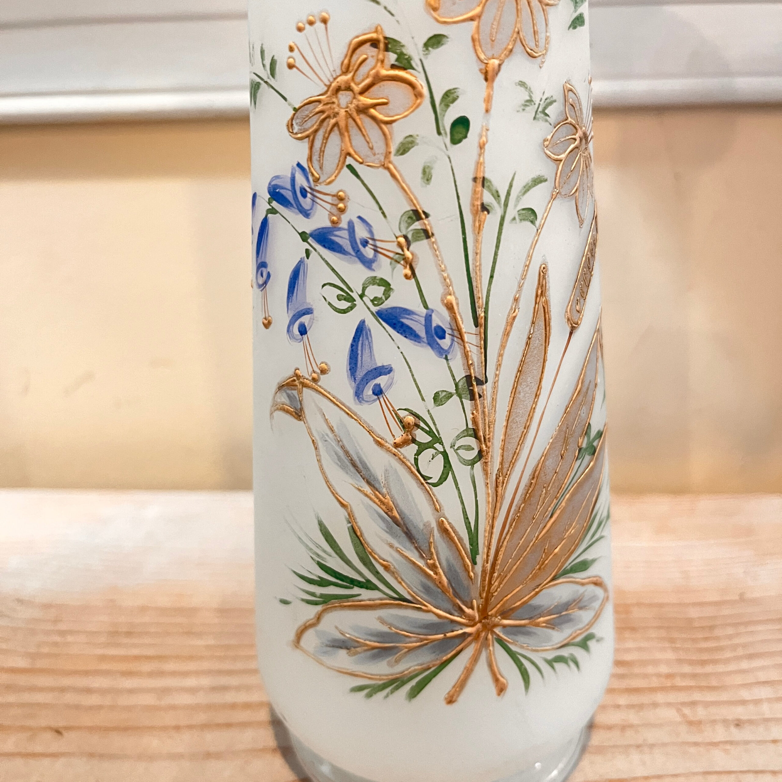 Beautiful Victorian hand-blown Frosted, Satin Glass Vase with Enamel Applique of Gold and Blue Flowers. Approx. 9″ Tall. In good vintage condition.