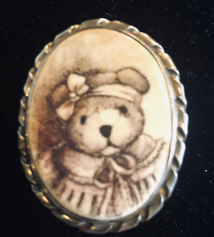 This scrimshaw brooch is for the lover of teddy bears! What a sweet face she has! Did you know there is a famous teddy bear that was actually based off a sweet female cub? It is Winnie the Pooh!