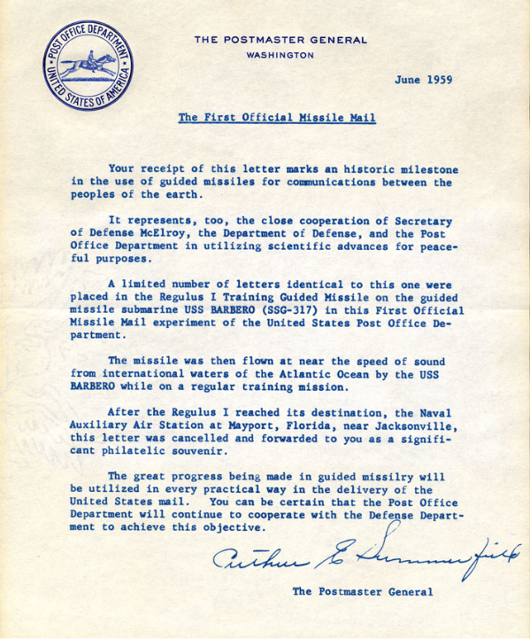 In 1959, the U.S. Navy submarine USS Barbero had an actual branch office set up on their submarine for mail delivery using “Missile Mail”. They used a Regulus cruise missile by replacing the nuclear warhead with two Post Office mail containers and launched the missile to Florida.